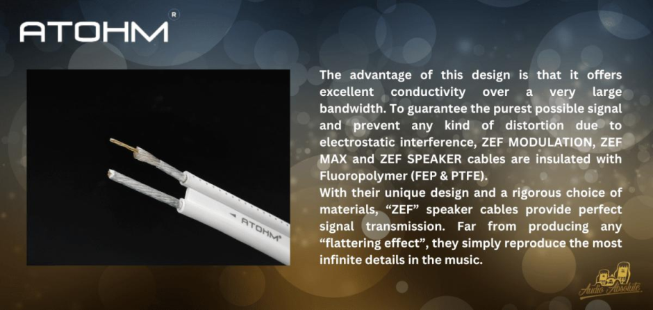 The structure of ZEF MAX Speaker Cable consists of a central core made of OCC copper (extremely pure single crystal copper) surrounded by multiple strands of solid silver-plated Ultra Cast OFC copper. The advantage is that it offers excellent conductivity over a very large bandwidth. To guarantee the purest possible signal and prevent any kind of distortion due to electrostatic interference, ZEF MODULATION, ZEF MAX and ZEF SPEAKER cables are insulated with Fluoropolymer.