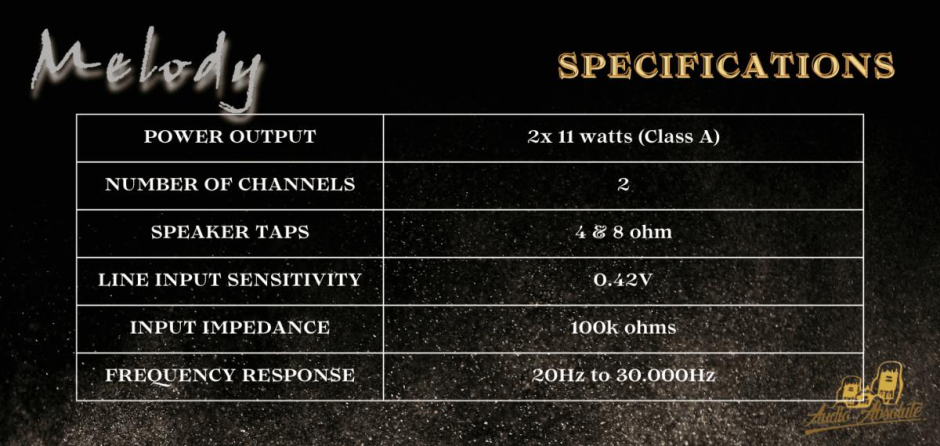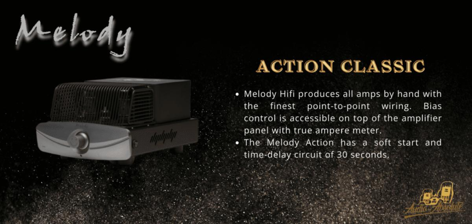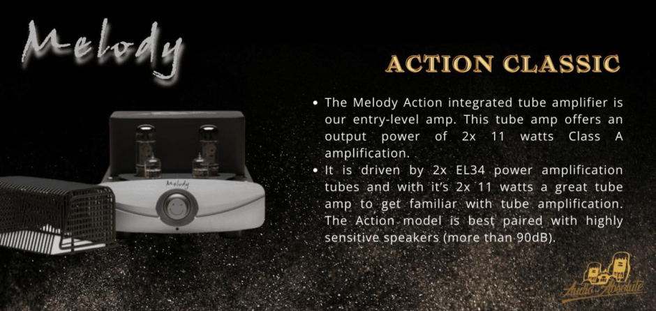 Melody Action Classic is an integrated tube amplifier is our entry-level amp. This tube amp offers an output power of 2x 11 watts Class A amplification. It is driven by 2x EL34 power amplification tubes and with it’s 2x 11 watts a great tube amp to get familiar with tube amplification.