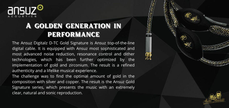 The Ansuz Digitalz D-TC Gold Signature is Ansuz top-of-the-line digital cable. It is equipped with Ansuz most sophisticated and most advanced noise reduction, resonance control and dither technologies, which has been further optimized by the implementation of gold and zirconium.