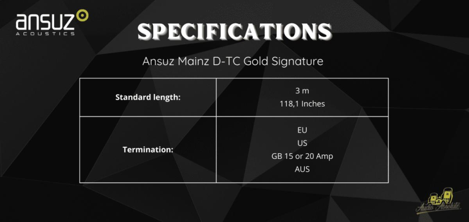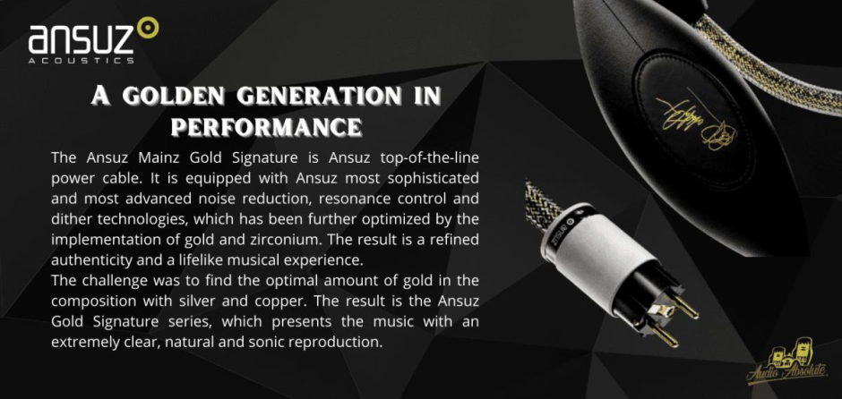The Ansuz Mainz Gold Signature is Ansuz top-of-the-line power cable. It is equipped with Ansuz most sophisticated and most advanced noise reduction, resonance control and dither technologies, which has been further optimized by the implementation of gold and zirconium.
