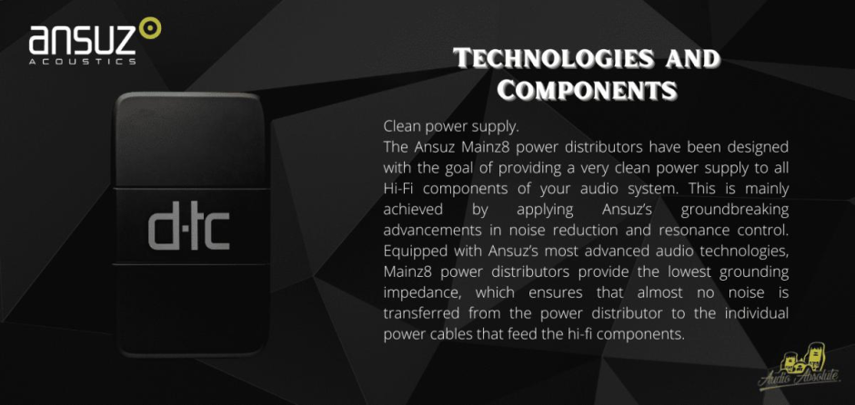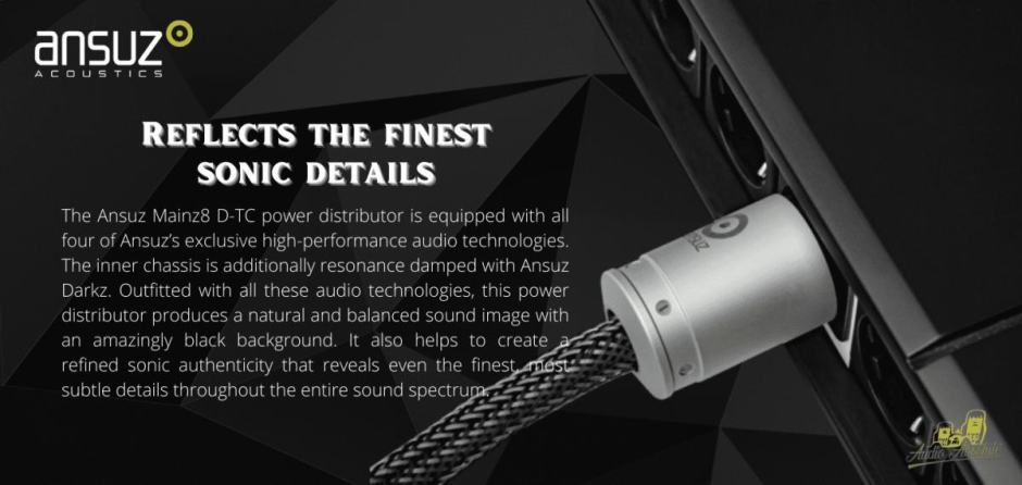 The Ansuz Mainz8 D-TC power distributor is equipped with all four of Ansuz’s exclusive high-performance audio technologies. The inner chassis is additionally resonance damped with Ansuz Darkz. Outfitted with all these audio technologies.