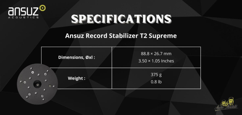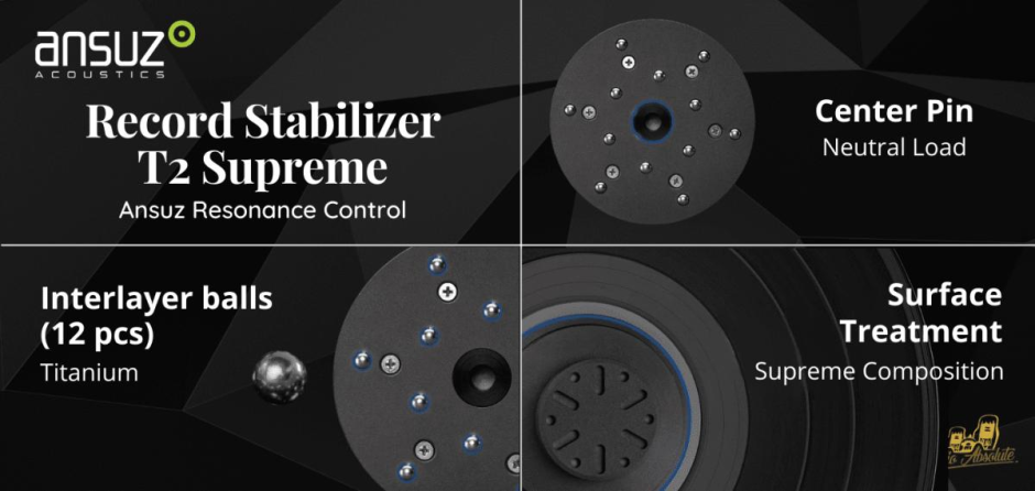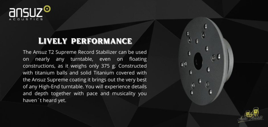 The Ansuz T2 Supreme Record Stabilizer can be used on nearly any turntable, even on floating constructions, as it weighs only 375 g. Constructed with titanium balls and solid Titanium covered with the Ansuz Supreme coating it brings out the very best of any High-End turntable. You will experience details and depth together with pace and musicality you haven´t heard yet.