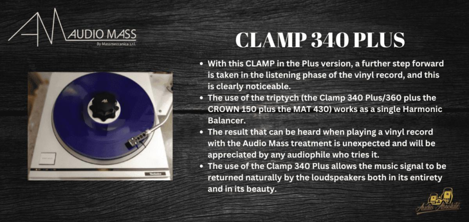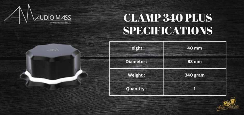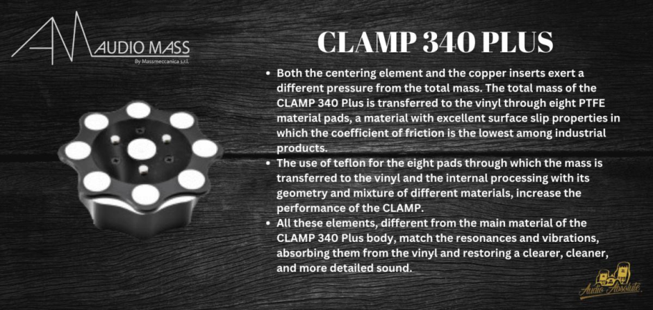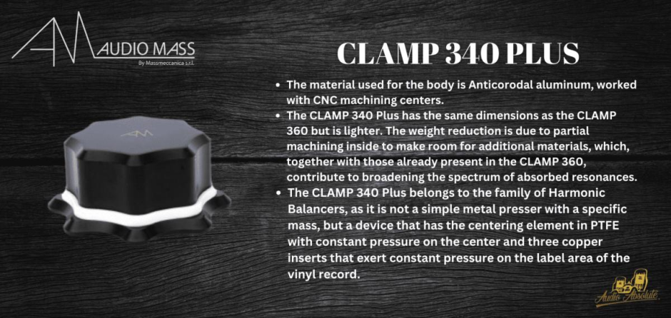 AUDIO MASS CLAMP 340 PLUS has the same dimensions as the CLAMP 360 but is lighter. The weight reduction is due to partial machining inside to make room for additional materials, which, together with those already present in the CLAMP 360, contribute to broadening the spectrum of absorbed resonances.