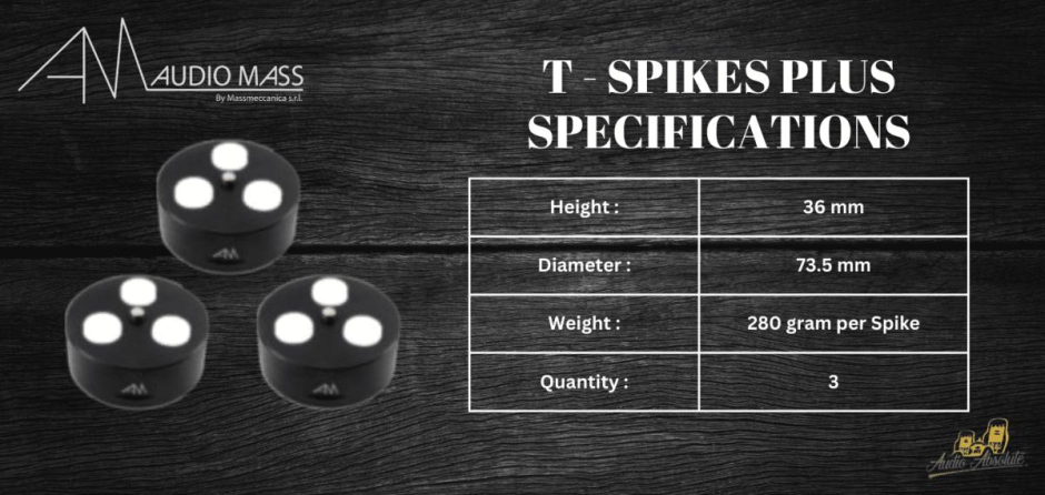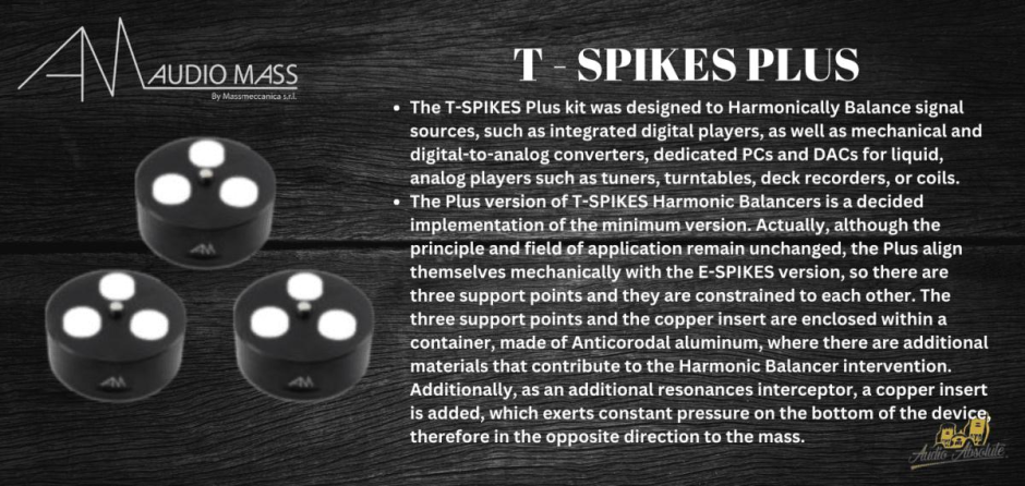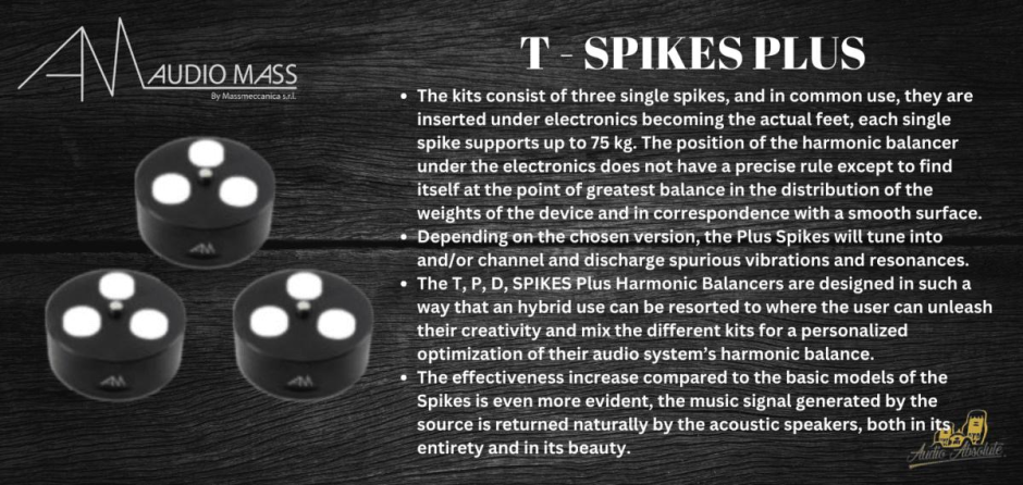 AUDIO MASS T-SPIKES PLUS kit was designed to Harmonically Balance signal sources, such as integrated digital players, as well as mechanical and digital-to-analog converters, dedicated PCs and DACs for liquid, analog players such as tuners, turntables, deck recorders, or coils.