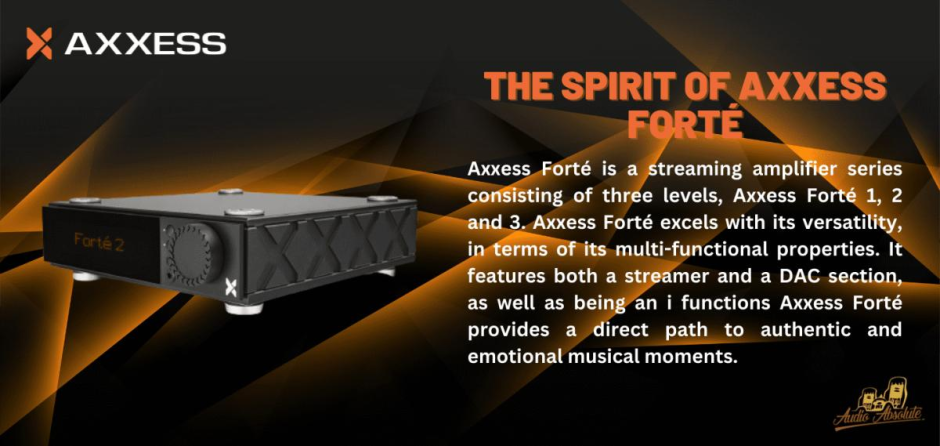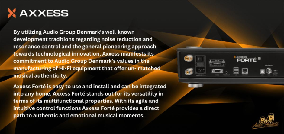 Axxess Forté is a streaming amplifier series consisting of three levels, Axxess Forté 1, 2 and 3. Axxess Forté excels with its versatility, in terms of its multi-functional properties. It features both a streamer and a DAC section, as well as being an integrated amplifier and a headphone amplifier.