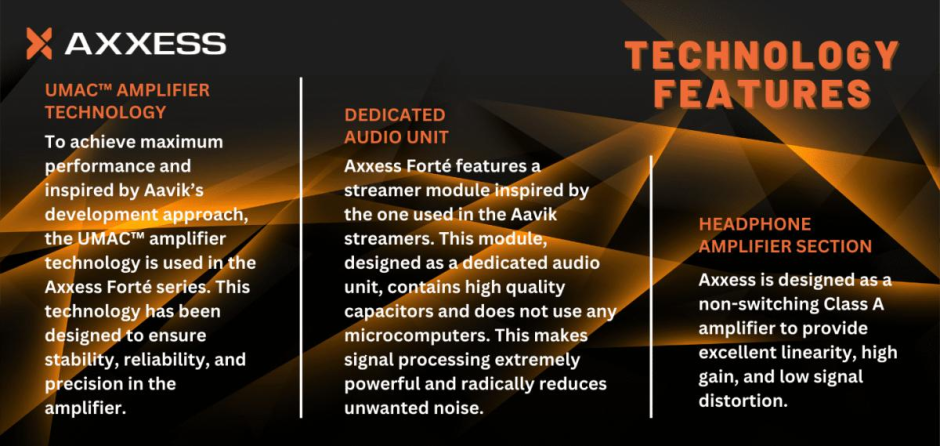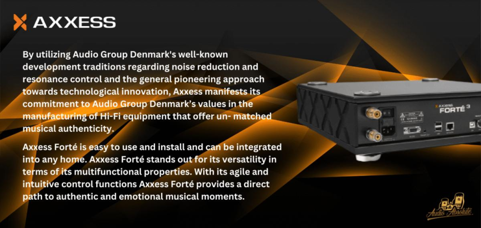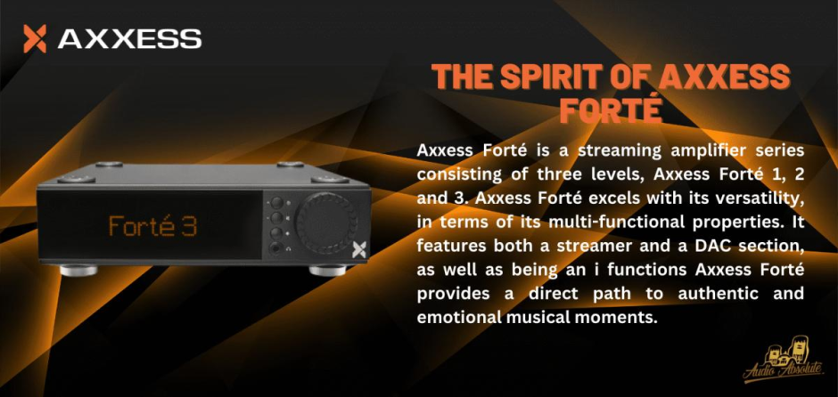 Axxess Forté is a streaming amplifier series consisting of three levels, Axxess Forté 1, 2 and 3. Axxess Forté excels with its versatility, in terms of its multi-functional properties. It features both a streamer and a DAC section, as well as being an integrated amplifier and a headphone amplifier.
