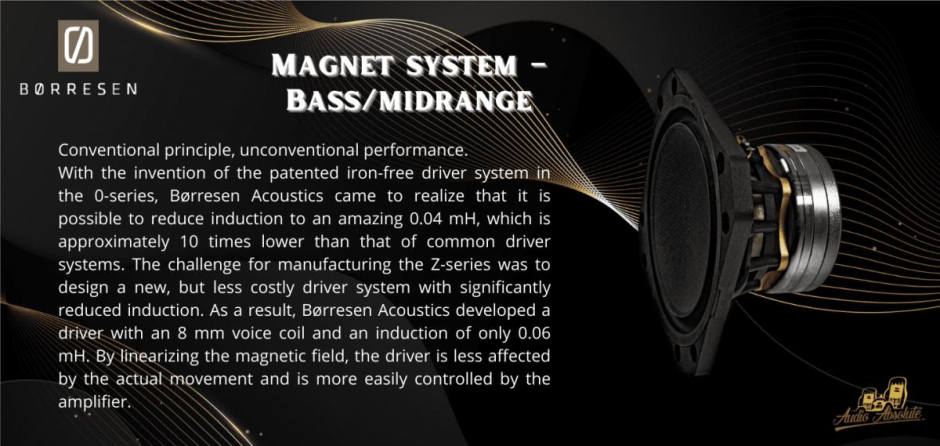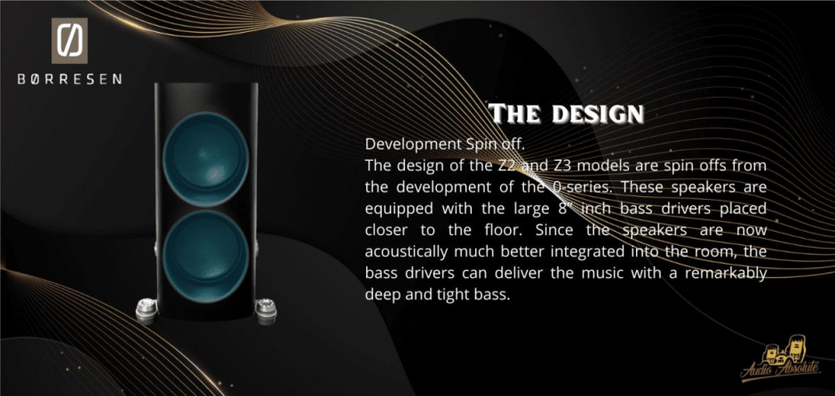 The Børresen Z3 speaker has two 8” bass drivers, which are both located closer to the room floor and therefore, acoustically much better integrated into the room. The enhanced dynamic and deep bass range creates an outstanding musical transparency punctuated by a rock solid bass.