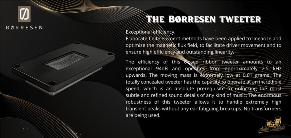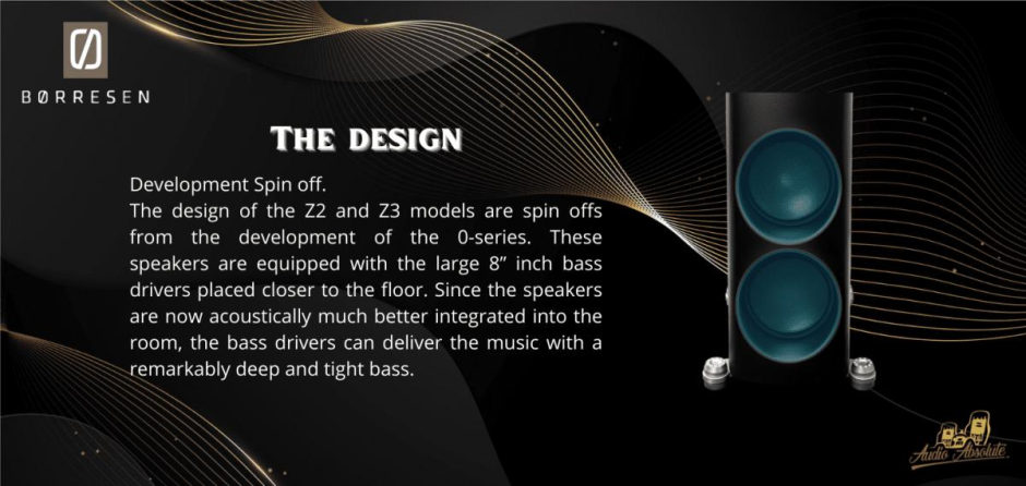 The Børresen Z3 speaker has two 8” bass drivers, which are both located closer to the room floor and therefore, acoustically much better integrated into the room. The enhanced dynamic and deep bass range creates an outstanding musical transparency punctuated by a rock solid bass.