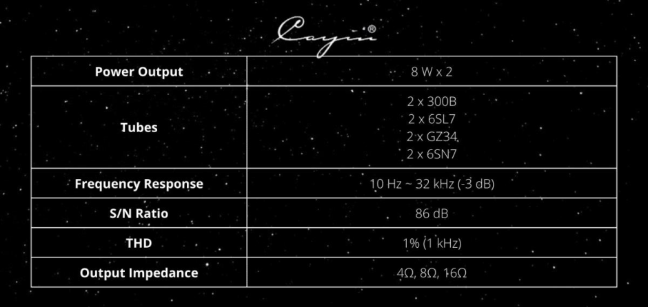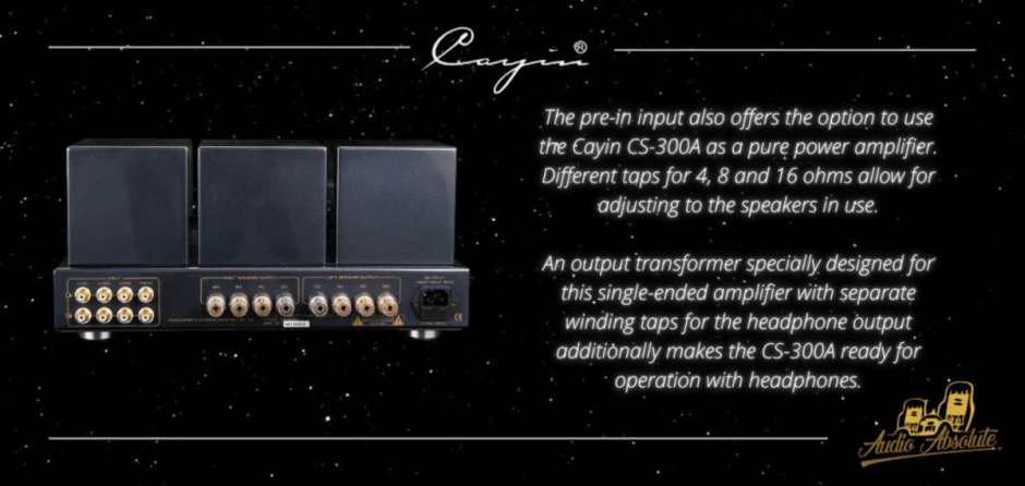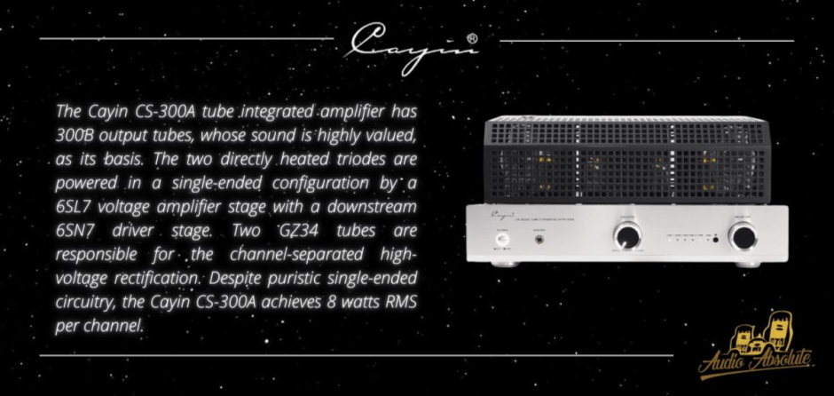 Cayin's new CS-300A integrated amplifier with single-ended tube design is equipped with two direct-heated 300B output tubes, 8 watts of RMS per channel and various technical features that are supposed to turn it into a puristic highlight for tube fans.