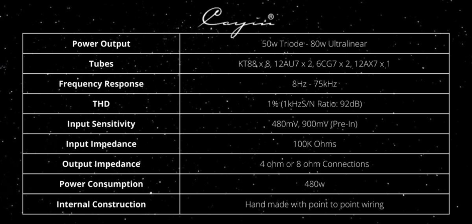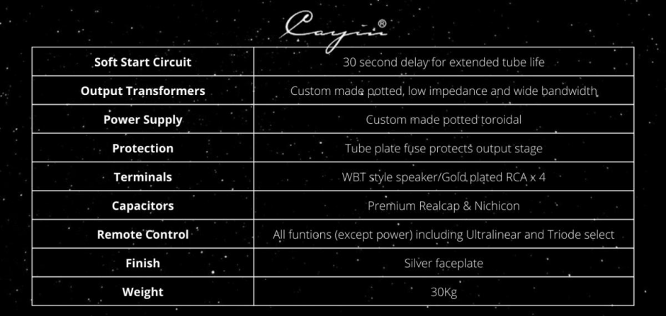 Cayin CS-300P MK2 Push-Pull Class A, With Internal Construction of Hand made with point to point wiring. The Output Transformers is Custom made potted, low impedance and wide bandwidth. The Protection is Tube plate fuse protects output stage. Remote Controls all funtions except power.
