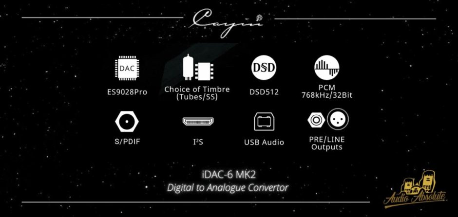 The Cayin iDAC-6 MK2 is the company’s 2nd-generation i-Series hybrid tube DAC capable of up to DSD512 and PCM 768kHz decoding.