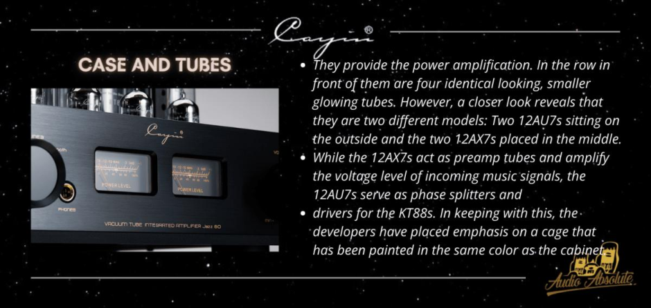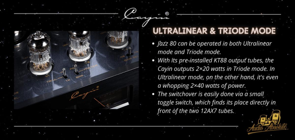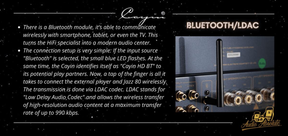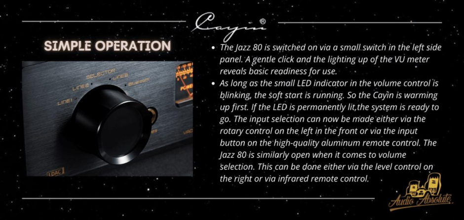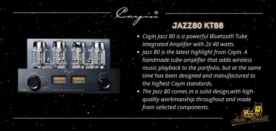 Cayin Jazz 80 is a powerful Bluetooth Tube Integrated Amplifier with 2x 40 watts. The Jazz 80 is the latest highlight from Cayin. A handmade tube amplifier that adds wireless music playback to the portfolio, but at the same time has been designed and manufactured to the highest Cayin standards.