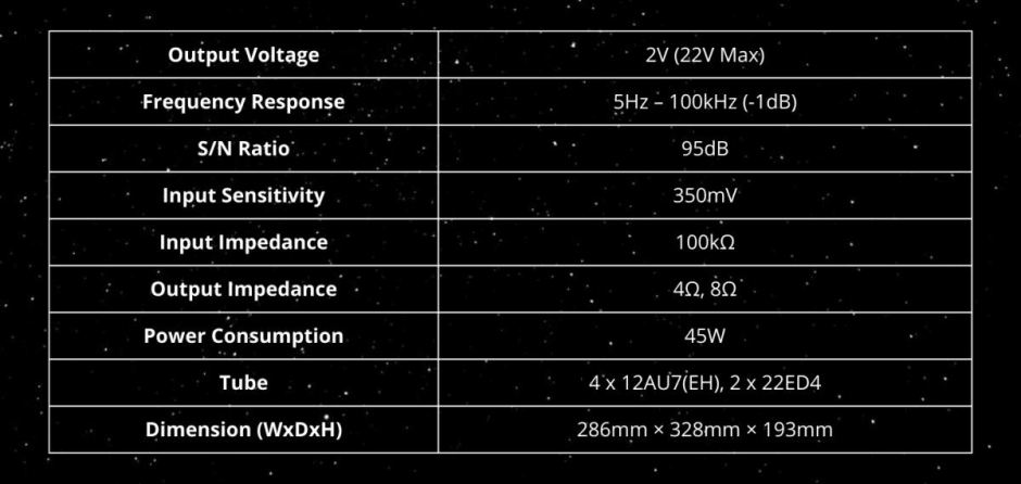 Hand-made construction with the finest point-to-point wiring. With OUT1, OUT2 output terminals. Specially designed EI transformer for power supply. Four JJ 12AU7/ECC82 for the line amplification. Two RCA 22DE4 rectifier tube for rectification. Multicap and TAKMAN resistor are applied.
