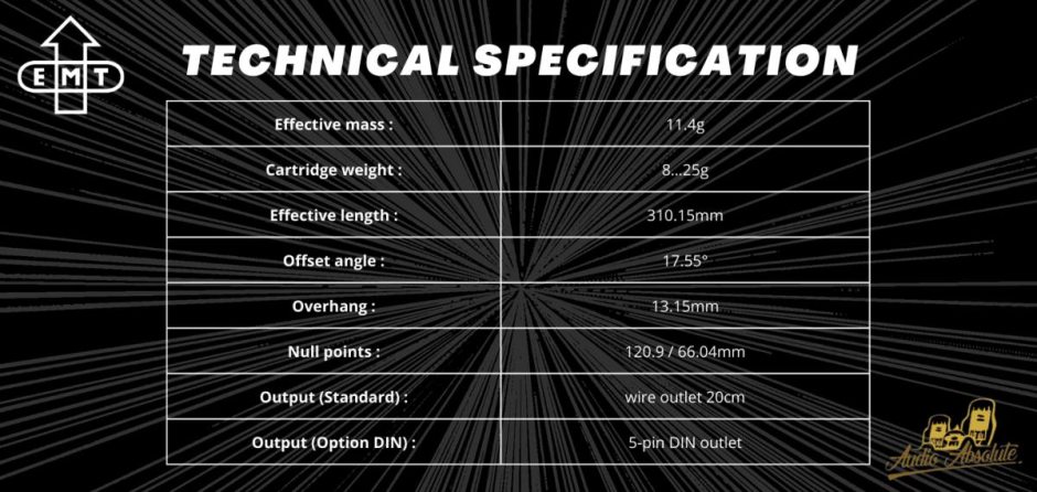Within the new EMT tonearm technology, we were able to combine most modern bearing- and manufacturing-technology with the traditional EMT design. Thus, the sound properties are im-proved significantly, while at the same time the long history of this product-line is respected.