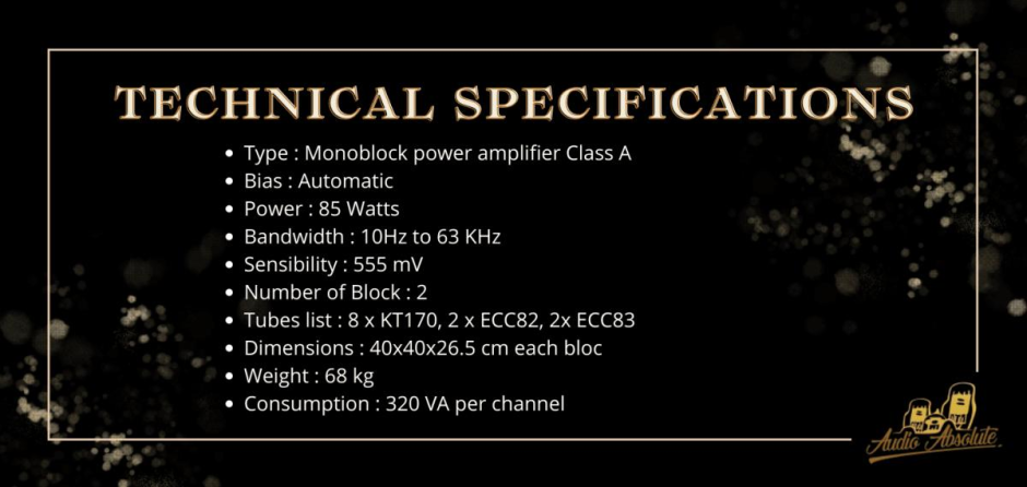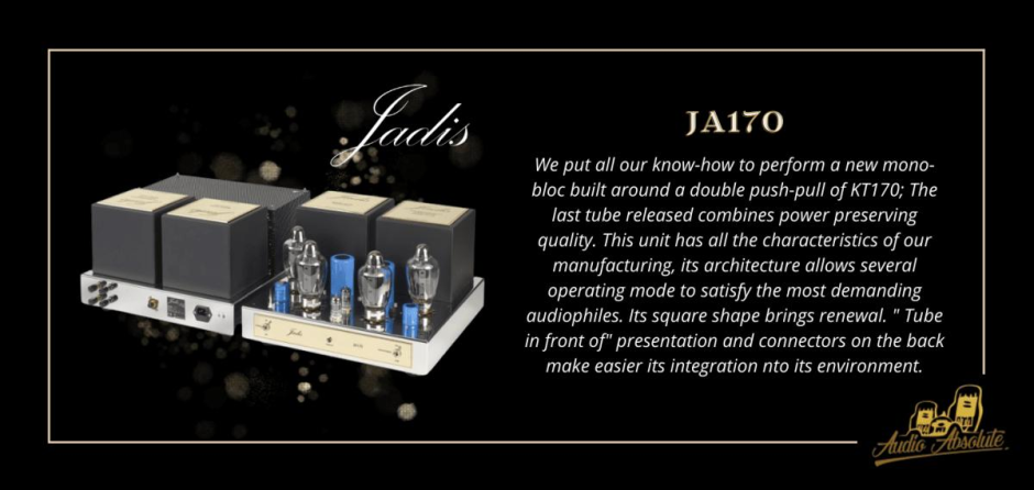 Jadis JA170 is a new Monoblock built around a double push-pull of KT170; The last tube released combines power preserving quality. Its square shape brings renewal. " Tube in front of" presentation and connectors on the back make easier its integration nto its environment.