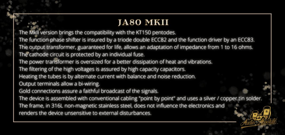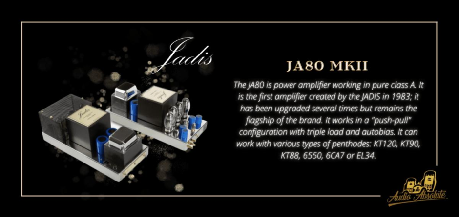 Jadis JA80 is a power amplifier working in pure class A. It is the first amplifier created by the JADIS in 1983; it has been upgraded several times but remains the flagship of the brand. It works in a "push-pull" configuration with triple load and autobias.