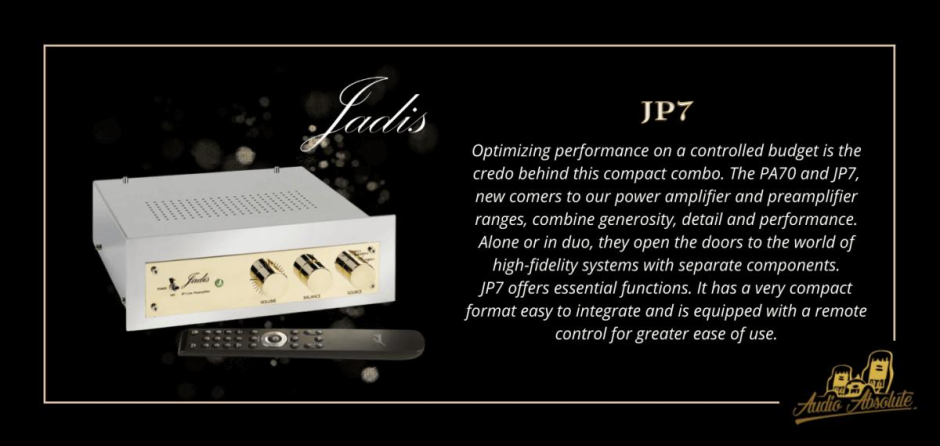 Jadis JP7 offers essential functions. It has a very compact format easy to integrate and is equipped with a remote control for greater ease of use. The PA70 and JP7, new comers to our power amplifier and preamplifier ranges, combine generosity, detail and performance.