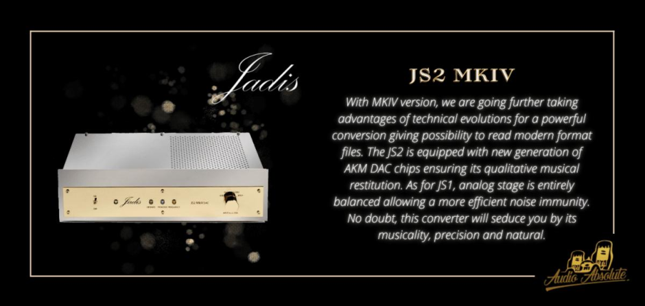 Jadis JS2 MKIV version, we are going further taking advantages of technical evolutions for a powerful conversion giving possibility to read modern format files. The JS2 is equipped with new generation of AKM DAC chips ensuring its qualitative musical restitution.