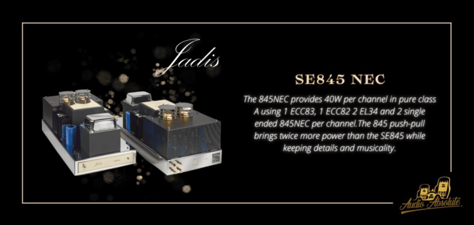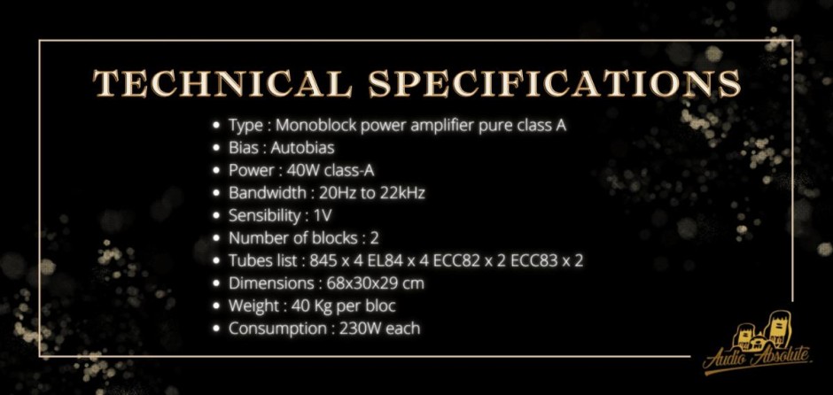 The 845NEC provides 40W per channel in pure class A using 1 ECC83, 1 ECC82 2 EL34 and 2 single ended 845NEC per channel.The 845 push-pull brings twice more power than the SE845 while keeping details and musicality.
