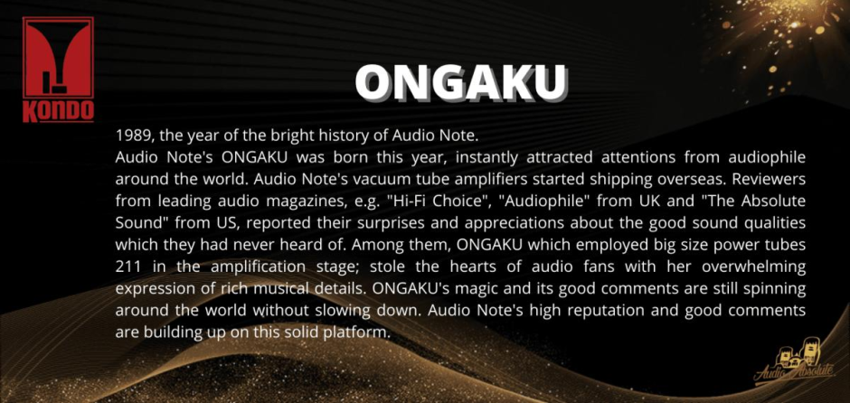 Audio Note's ONGAKU was born in 1989, instantly attracted attentions from audiophile around the world. ONGAKU employed big size power tubes 211 in the amplification stage; stole the hearts of audio fans with her overwhelming expression of rich musical details.