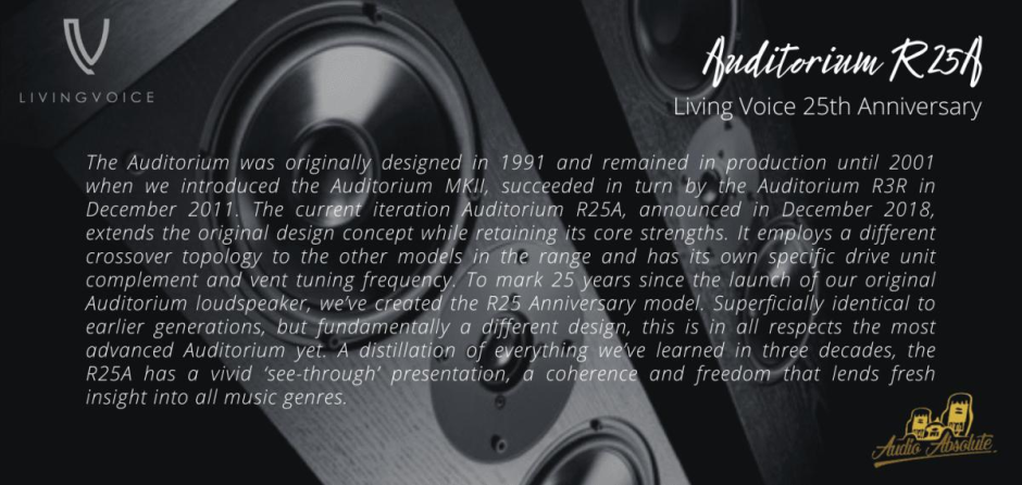 The current iteration Auditorium R25A, announced in December 2018, extends the original design concept while retaining its core strengths. It employs a different crossover topology to the other models in the range and has its own specific drive unit complement and vent tuning frequency.