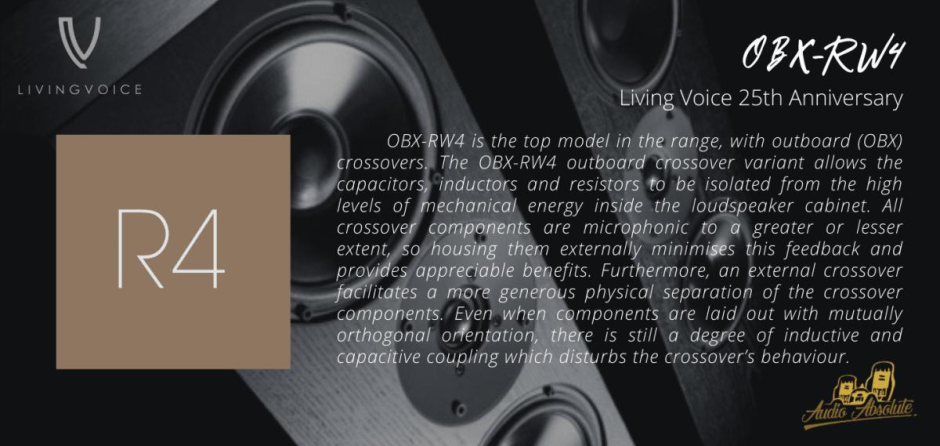 Living Voice OBX-RW4 outboard crossover variant allows the capacitors, inductors and resistors to be isolated from the high levels of mechanical energy inside the loudspeaker cabinet. All crossover components are microphonic to a greater or lesser extent, so housing them externally minimises this feedback.