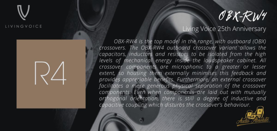 Living Voice OBX-RW4 outboard crossover variant allows the capacitors, inductors and resistors to be isolated from the high levels of mechanical energy inside the loudspeaker cabinet. All crossover components are microphonic to a greater or lesser extent, so housing them externally minimises this feedback.