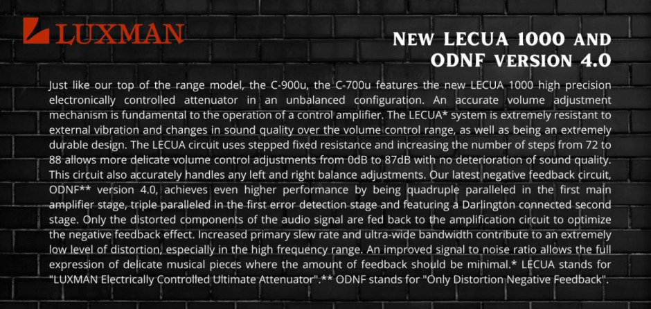 The C-700u control amplifier is our new middle of the range model that inherits some of our magnificent innovations, seen in our high end model, the C-900u, including our latest ODNF version 4.0 circuit, with significantly improved distortion characteristics and signal to noise performance.