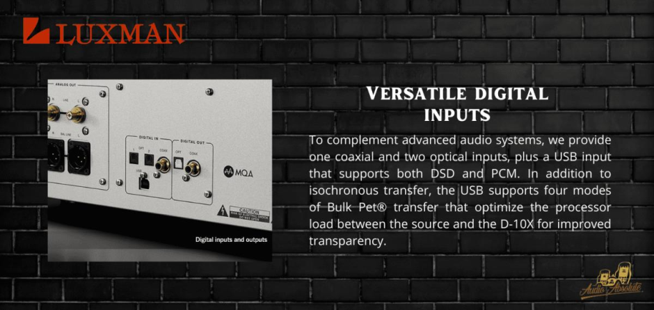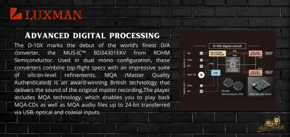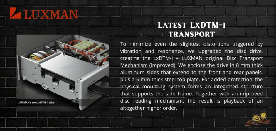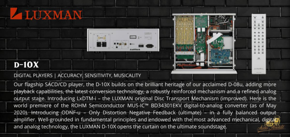 Our flagship SACD/CD player, the D-10X builds on the brilliant heritage of our acclaimed D-08u, adding more playback capabilities, the latest conversion technology, a robustly reinforced mechanism and a refined analog output stage. Introducing LxDTM-i – the LUXMAN original Disc Transport Mechanism (improved).