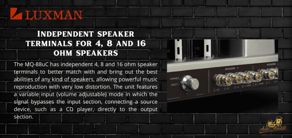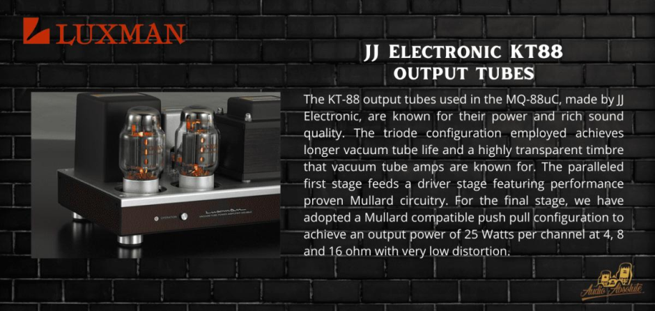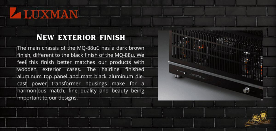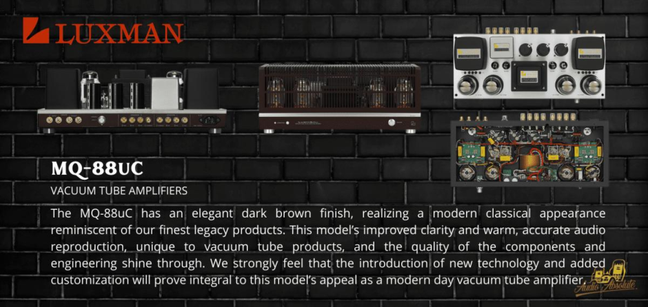 The MQ-88uC has an elegant dark brown finish, realizing a modern classical appearance reminiscent of our finest legacy products. This model’s improved clarity and warm, accurate audio reproduction, unique to vacuum tube products, and the quality of the components and engineering shine through.