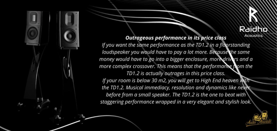 The performance from Raidho Acoustics TD1.2 is actually outrages in this price class. Musical immediacy, resolution and dynamics like never before from a small speaker. Raidho Acoustics TD1.2 is the one to beat with staggering performance wrapped in a very elegant and stylish look.