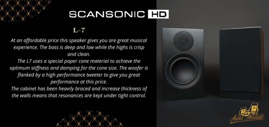 Scansonic HD L7 uses a special paper cone material to achieve the optimum stiffness and damping for the cone size. The woofer is flanked by a high performance tweeter to give you great performance at this price. The cabinet has been heavily braced and increase thickness of the walls means that resonances are kept under tight control.