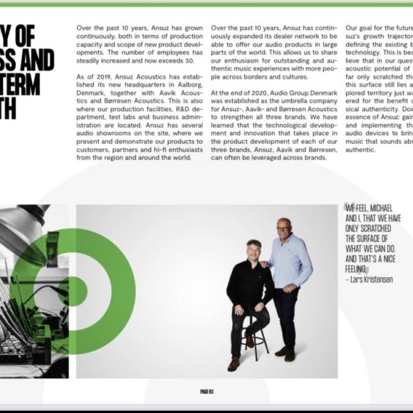 ตลอดระยะเวลา 10 ปีที่ผ่านมา Ansuz เติบโตอย่างต่อเนื่อง ทั้งในแง่ของกำลังการผลิตและการพัฒนาผลิตภัณฑ์ใหม่ ในปี 2019 Ansuz Acoustics ได้ก่อตั้งสำนักงานใหญ่แห่งใหม่ในเมืองอัลบอร์ก ประเทศเดนมาร์ก พร้อมด้วย Aavik Acoustics และ Borresen Acoustics ที่นี่ยังเป็นที่ตั้งของโรงงานผลิต แผนก R&D ห้องปฏิบัติการทดสอบ และการบริหารธุรกิจอีกด้วย Ansuz มีโชว์รูมเครื่องเสียงหลายแห่งบนเว็บไซต์ ซึ่งพวกเขานำเสนอและสาธิตผลิตภัณฑ์ให้แก่ลูกค้า คู่ค้า และผู้ที่ชื่นชอบเครื่องเสียงไฮไฟจากภูมิภาคและทั่วโลก และในช่วงสิ้นปี 2020 Audio Group Denmark ได้ก่อตั้งขึ้นในฐานะบริษัทในเครือของ Ansuz , Aavik และ Borrsen Acoustics เพื่อเสริมความแข็งแกร่งให้กับทั้งสามแบรนด์